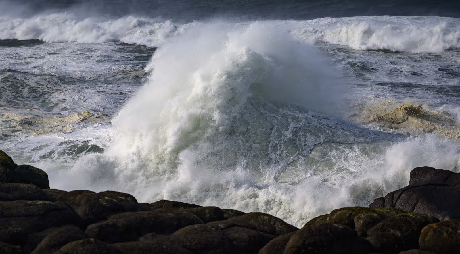 In a cataclysm of oceanic power, the mighty waves of the Pacific hurl themselves against the weathered stones of Boiler Bay. Sheets of far-flung spray lash coast and fill the air with a briny tang - droplets of sea water glittering in the morning sun like transient gems, bright against the dark of gather storms rolling in from the sea. Despite the turbulence, whales still frolic in the coastal shallows, and birds dive for fish in the lush jungles of kelp that wave languidly beneath the waves.